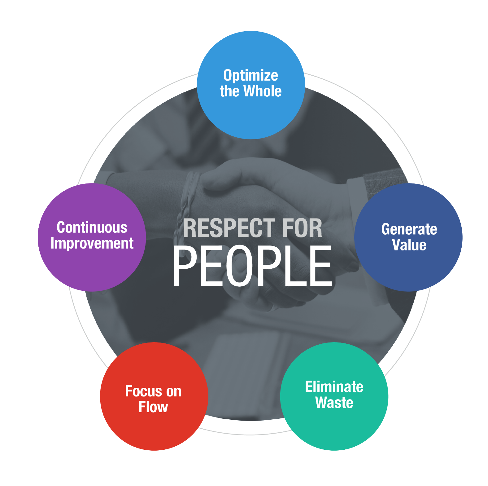 This is at the center of the circle because it is the bedrock concept behind Lean. In any organization or team - be it in our industry or in any aspect of daily life - if you don’t respect and trust the people you are working with, it is next to impossible to realize the true value of what you are trying to accomplish for your stakeholders. LCI helps organizations with exercises and training to encourage respect and trust amongst all team members so they are able to implement all Lean practices effectively.